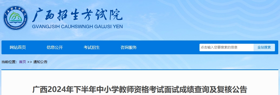 广西招生考试院于近日发布《广西2024年下半年中小学教师资格考试面试成绩查询及复核公告》,明确2024下半年教师资格考试面试结果1月7日发布,广西考生如对本人成绩有异议,可自成绩公布之日起10个工作日内提交复核申请。