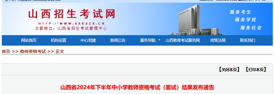 山西招生考试网于近日发布《山西省2024年下半年中小学教师资格考试(面试)结果发布通告》,明确2024下半年教师资格考试面试结果1月7日10:00发布,在山西省参加本次面试的考生,如对本人面试结果有异议,可于2025年1月7日至20日访问山西省中小学教师资格考试成绩复核申请平台申请面试结果复核。