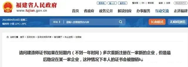 就在近日,官方对频繁注册一建的人员提出了监管措施。福建省住房和城乡建设厅发布的关于一建证书短期内频繁注册的问题回复说:建造师一年内多次更换注册单位的行为判定为频繁变更注册人员被列入异常监管对象。