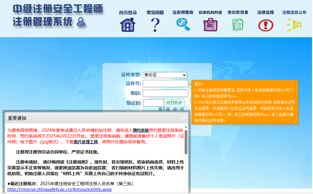 (一)注册申请:这是官网的核心功能之一。通过考试取得注册安全工程师执业资格证书的人员,可在该系统申请注册。注册类型包含初始注册、延续注册、变更注册和重新注册。例如,初始注册适用于首次获得证书后申请注册的人员;延续注册则是在注册有效期到期前,拟继续注册到原聘用单位时申请;变更注册用于注册有效期内,拟变更聘用单位或注册类别,以及聘用单位名称更名等情况;重新注册针对注册有效期已经过期的人员。