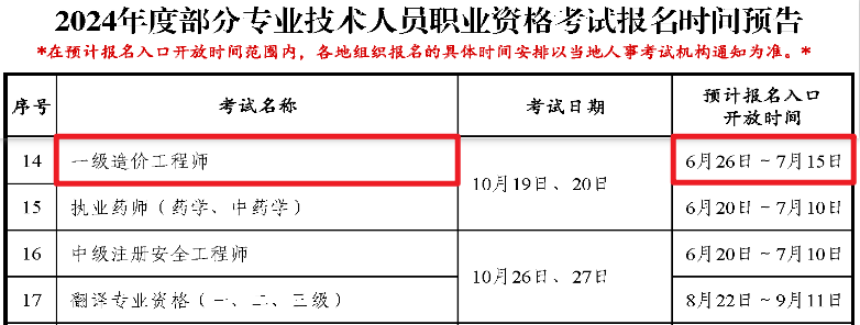 根据《2024年度专业技术人员职业资格考试重要提示》可知,2024年一级造价工程师报名时间预计为2024年6月26日至7月15日,各地报名时间有所差异。根据往年考试安排来看,该考试一般从每年8月开始报名,今年报名时间有所提前,大家需密切关注当地考试管理机构发布的报名通知,了解报考信息。