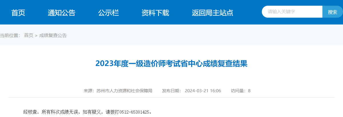 2024年3月21日,苏州市人事考试院发布了《2023年度一级造价师考试省中心成绩复查结果》,其中明确苏州一级造价师考试成绩复查已结束,核查结果为所有科次成绩无误。