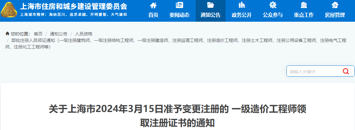 上海市2024年3月15日准予变更注册的一级造价工程师证书领取通知原文如下: