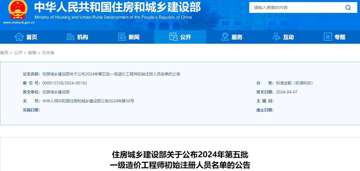 2024年4月10日,中华人民共和国住房和城乡建设部发布了《关于公布2024年第五批一级造价工程师初始注册人员名单的公告》,其中明确共有856人符合一级造价师初始注册条件,准予注册。
