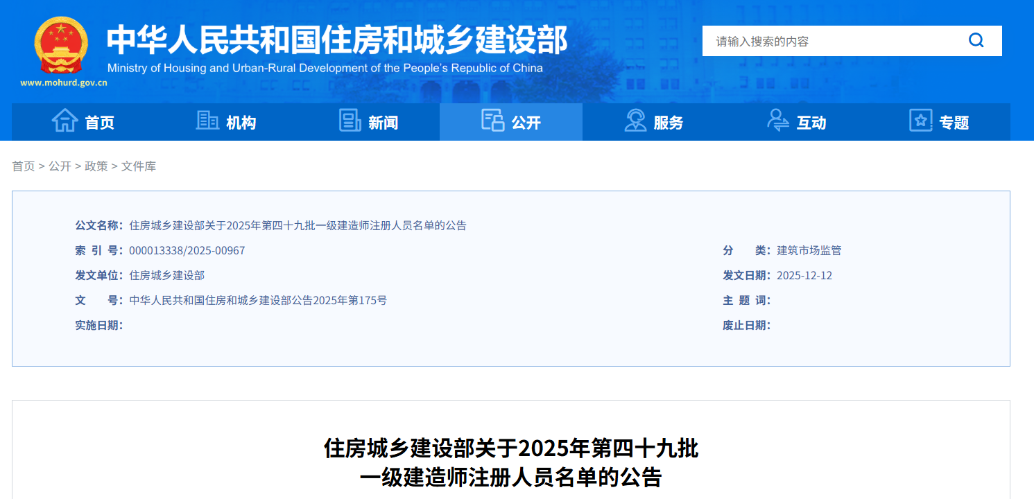 2025年第四十九批一级建造师注册人员名单公告已发布,本批次共13869人符合一级建造师注册条件,其中,初始注册共283人,延续注册1307人,增项注册151人,重新注册12128人。