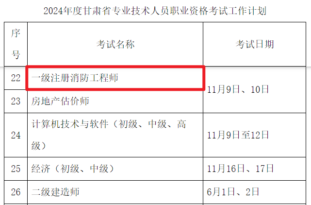 2024年甘肃一级消防工程师考试时间