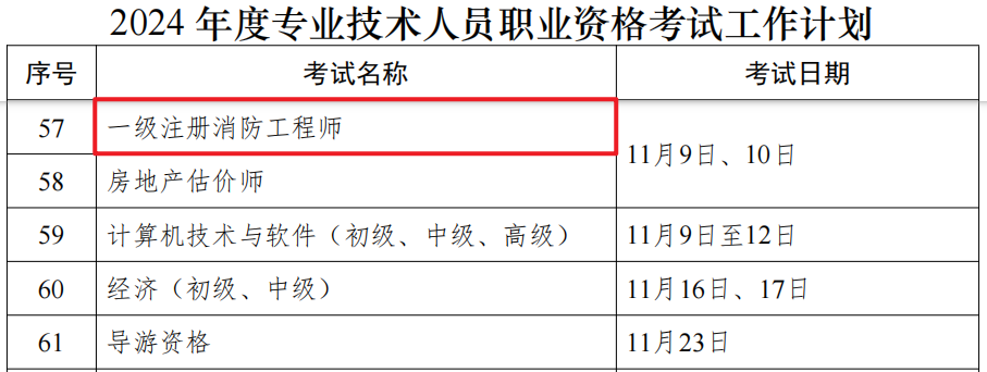根据中华人民共和国人力资源和社会保障部发布的通知可知,2024年福建省一级消防工程师考试时间为11月9日、10日。