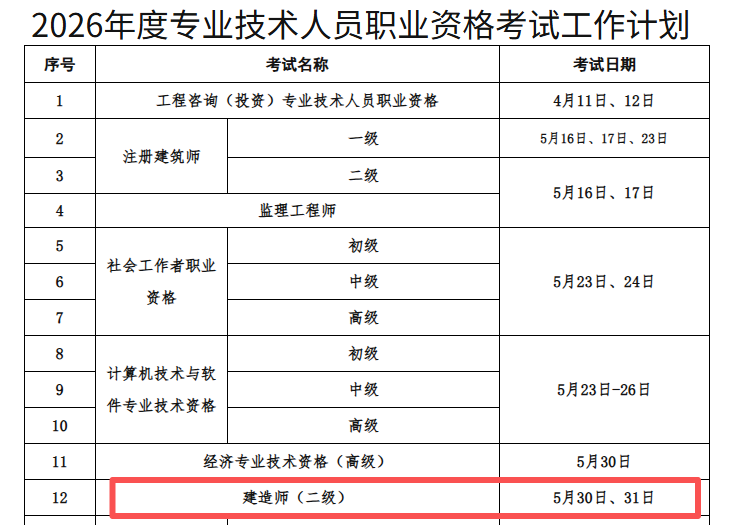 青海省人事考试信息网于近日发布《2026年度专业技术人员职业资格考试工作计划》,上述工作计划中明确2026年青海二级建造师考试时间为5月30日-5月31日。