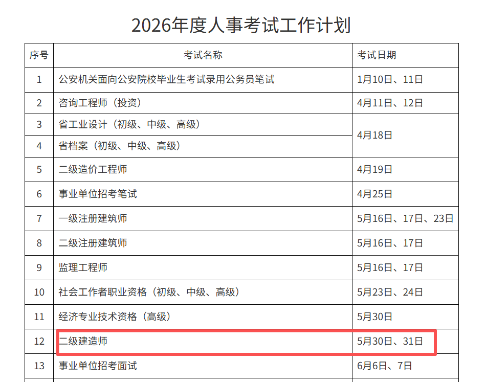2月10日,浙江人事考试网发布《2026年度人事考试工作计划》,上述计划中确定2026年浙江省二级建造师考试时间为5月30-31日,提醒相关考生做好备考准备。