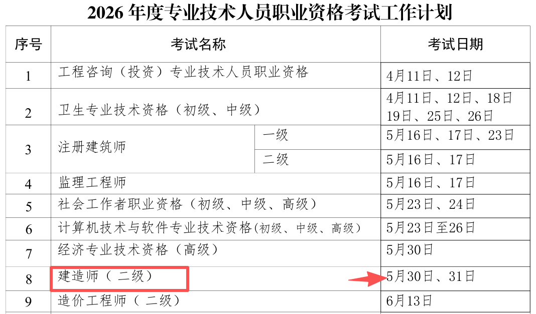 宁夏人事考试中心于2026年2月9日发布《2026年度专业技术人员资格考试工作计划》,上述工作计划中明确了29项考试2026年宁夏考区考试时间,其中包括2026年宁夏二级建造师考试时间,确定在5月30-31日进行。