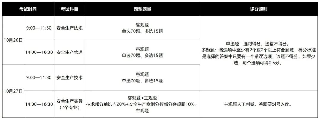 根据历年规律预测,2026年中级注册安全工程师考试预计将于10月24日、25日举行。考试分为4个半天进行,每个科目的考试时长统一为2.5小时。具体日程如下: