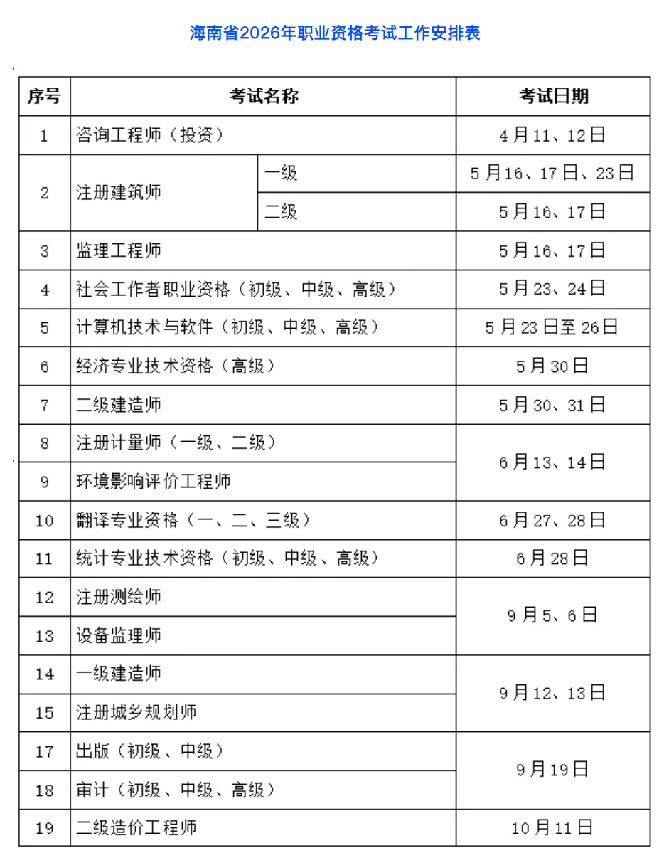 从时段看,根据《海南省2026年职业资格考试工作安排表》,4月至11月,陆续有职业资格考试。