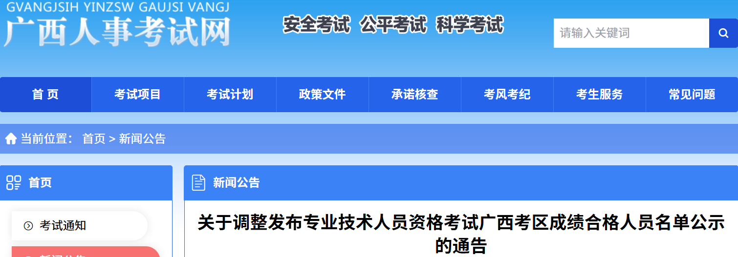 关于调整发布专业技术人员资格考试广西考区成绩合格人员名单公示的通告