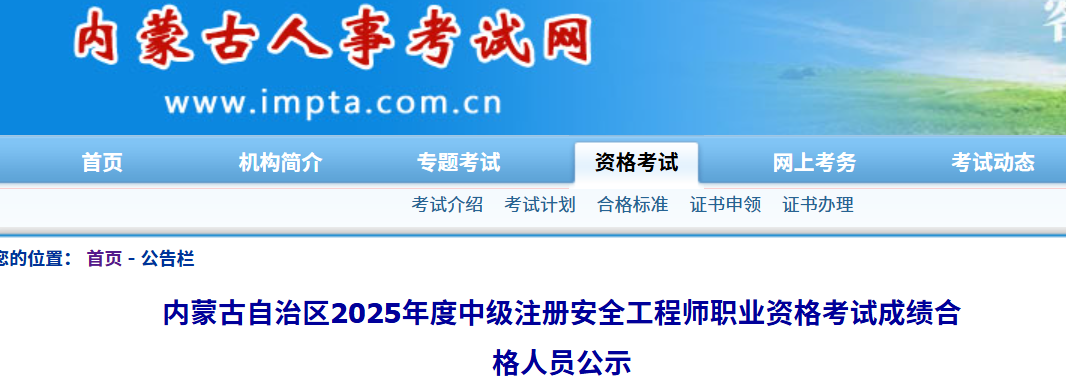 内蒙古自治区2025年度中级注册安全工程师职业资格考试成绩合格人员公示