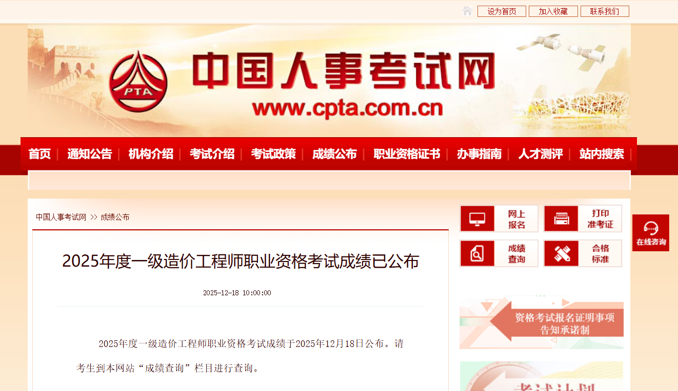 2025年一级造价工程师考试成绩查询通道于12月18日10时正式开启!考生可通过中国人事考试网(http://www.cpta.com.cn)快速查询成绩。