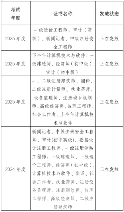 请在中国人事考试网报名所选考区为眉山且未申请省级“证书直邮”的合格人员到眉山市人事考试中心领取合格证书。2025年度一级造价工程师、审计(高级)、新闻记者、中级注册安全工程师等合格证书已完成省级办理流程,现抵达眉山市人事考试中心。证书领取分为现场领取和申请邮寄两种方式,请查询后表确认证书可领取后,按需选择证书领取方式。
