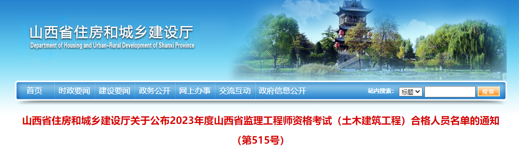 8月9日,山西省住房和城乡建设厅发布了“关于公布2023年度山西省监理工程师资格考试(土木建筑工程)合格人员名单的通知”,其中1965人合格。