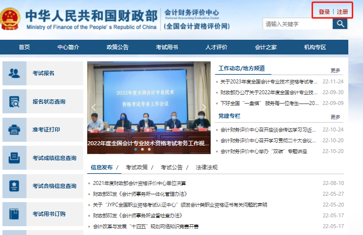 1、登录进入全国会计资格评价网(http://kzp.mof.gov.cn/)在页面中点击右上方“登录/注册”链接。