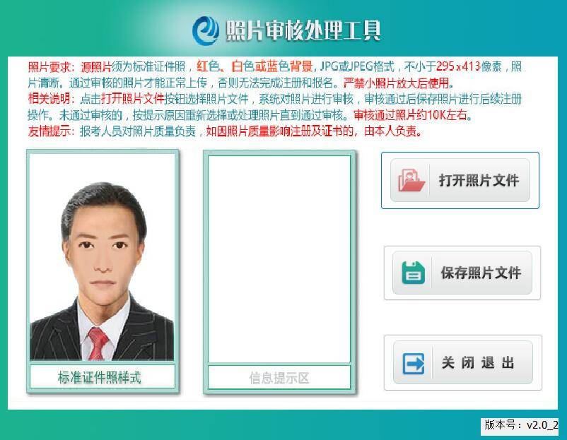 报名时使用的照片,将用于制作准考证、会计专业技术资格证书等。考生须准备标准证件数字照片(支持白、蓝、红色背景,推荐使用白色,JPG格式,像素大于等于295X413),下载照片审核处理工具,按照规定要求,对报名照片格式进行预处理,通过审核并保存后再进行上传。
