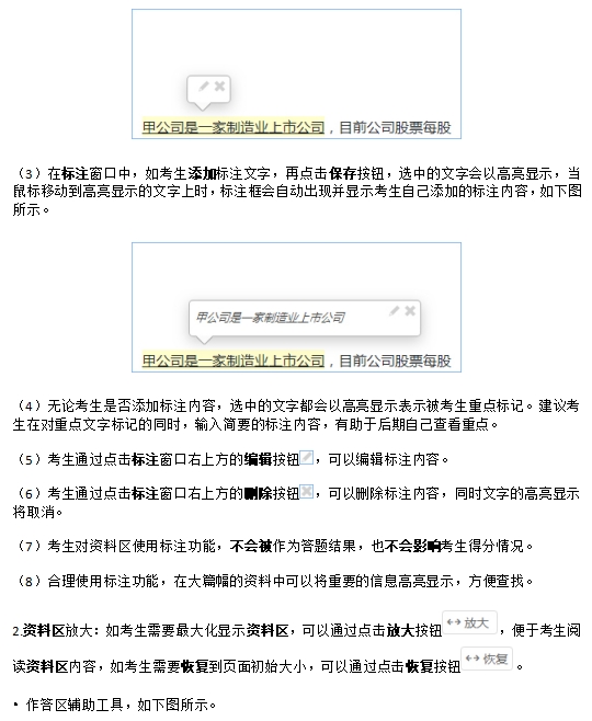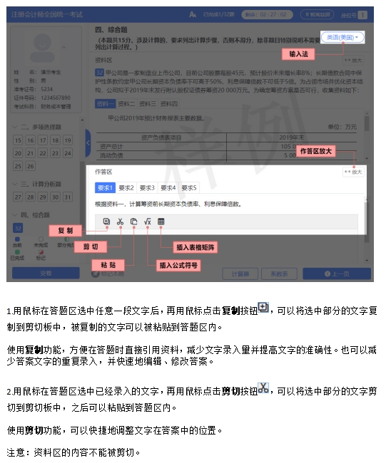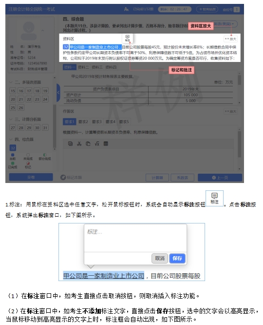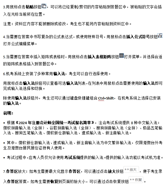 根据2024年注册会计师机考模拟系统显示,考生在开始答题前,可以查看机考操作说明,其中详细标明了注会考试主观题答题页面及辅助功能操作说明,考生可以提前熟悉机考环境和电子化试题形式。