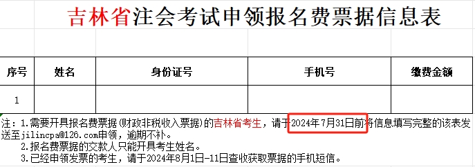 需要开具报名费票据(财政非税收入票据)的吉林省考生,请于2024年7月31日前,将信息填写完整的《吉林省注会考试申领报名费票据信息表》(见附件)发送至jilincpa@126.com申领,逾期不补。