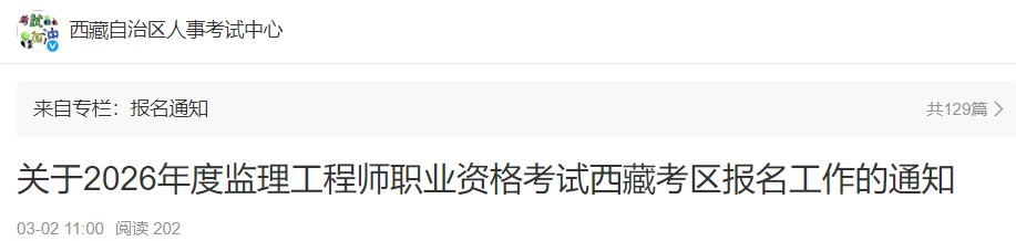 根据人社部人事考试中心《关于2026年度监理工程师职业资格考试考务工作的通知》(人考中心函〔2026〕3号)安排,现就做好我区2026年度监理工程师职业资格考试报名工作有关事项通知如下: