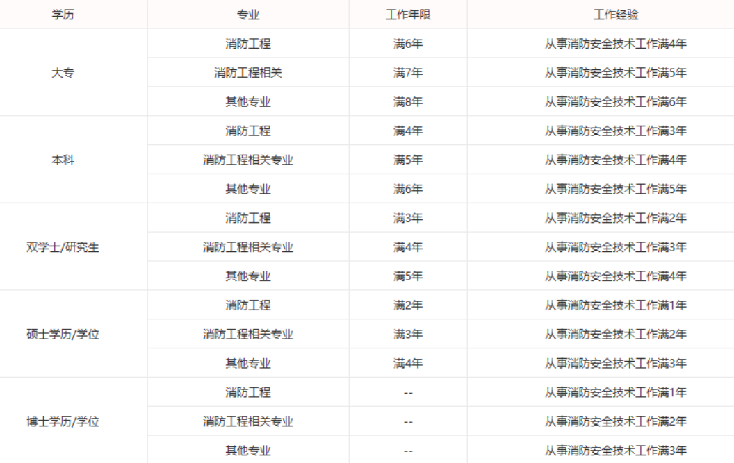本科:消防工程专业工作满4年,其中从事消防安全技术工作满3年;消防工程相关专业工作满5年,其中从事消防安全技术工作满4年;其他专业工作满6年,其中从事消防安全技术工作满5年。
