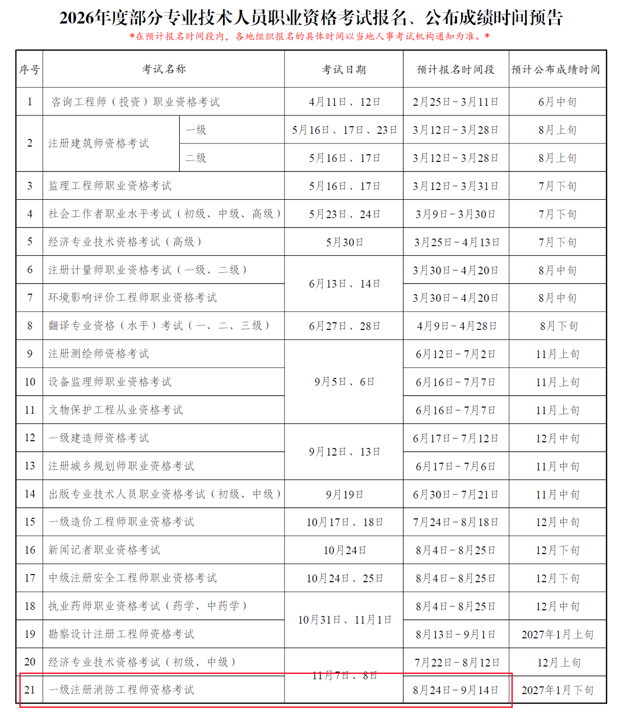 2026年度部分专业技术人员职业资格考试报名、公布成绩时间预告