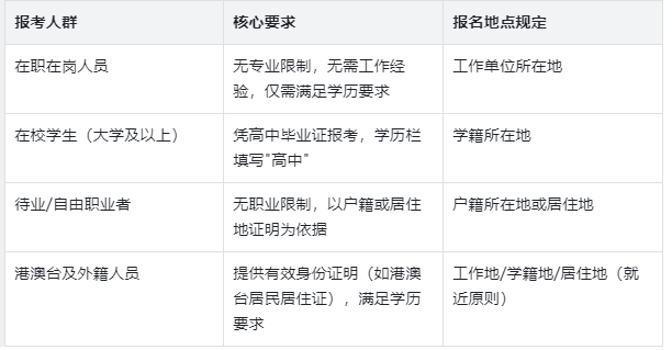 除通用条件外,部分特殊人群的报考资格有专门规定,涵盖在校学生、职场人士、港澳台及外籍人员等,需对照自身情况精准判断。