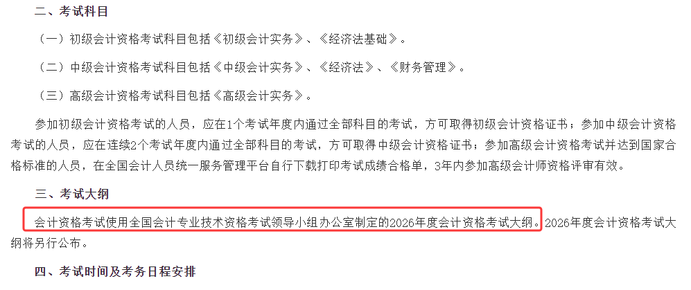 明确:会计资格考试使用全国会计专业技术资格考试领导小组办公室制定的2026年度会计资格考试大纲。