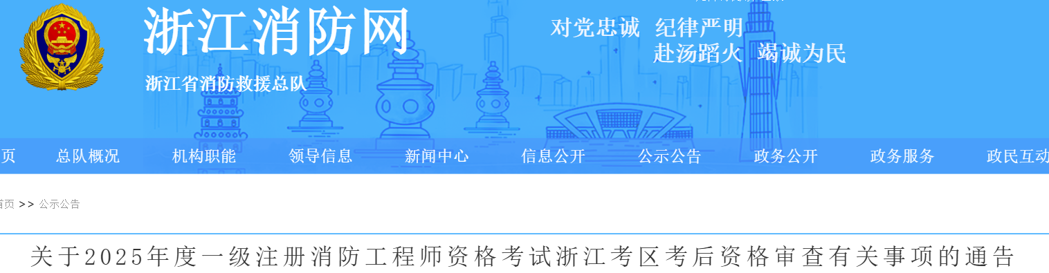 关于2025年度一级注册消防工程师资格考试浙江考区考后资格审查有关事项的通告
