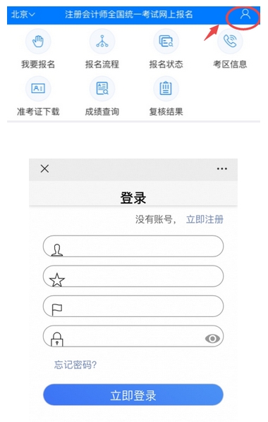 第二步:点击右上角图像,去登录账号,没有账号的考生请先注册。