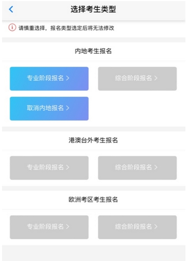 第四步:选择对应的考试阶段,大部分考生是选择内地考生专业阶段报名。
