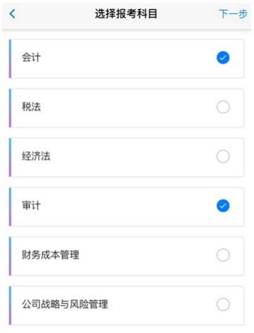 第八步:选择专业阶段的报考科目,可以多选,考生可以根据自己的实际情况进行科目的选择,科目选择好之后点击下一步。