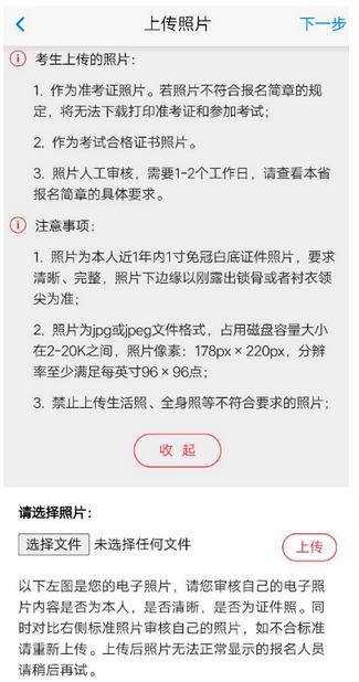 1.照片为本人近1年内1寸免冠白底证件照片,要求清晰、完整,照片下边缘以刚露出锁骨或者衬衣领尖为准。