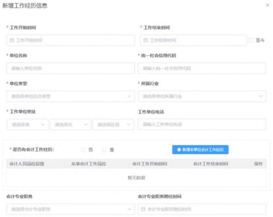 在工作经历页中点击新增进行工作经历的信息采集(如下图)。选择工作开始时间和工作结束时间,工作结束时间可以选择至今。在填写完单位名称、统一社会信用代码、单位类型、所属行业、工作单位地址、工作单位电话后选择是否有会计工作经历。若选择“是”,需要新增本单位会计工作经历并上传会计工作经历证明。会计专业职务为非必填,如果填写了会计专业职务需要选择会计专业职务聘任时间(会计专业职务聘任时间不能早于工作开始时间)以及上传会计专业职务聘任文件或证明。新增以往工作信息真实,无虚假内容,并自愿承担由此产生的所有后果。至今的工作按照页面提示要求进行上传证明材料。