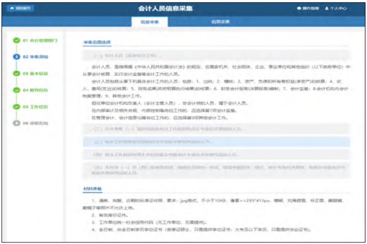 注:(1) 选择“会计人员”的,后面“工作经历”采集时需要填写“会计工作经历”。