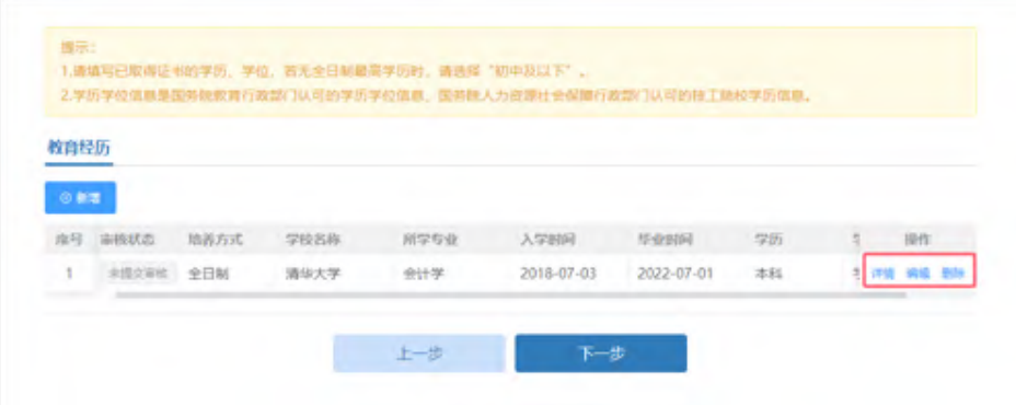 在填写完教育经历信息后页面表格会回显填写完的信息,可以进行查看详情、编辑以及删除操作,如下图所示:
