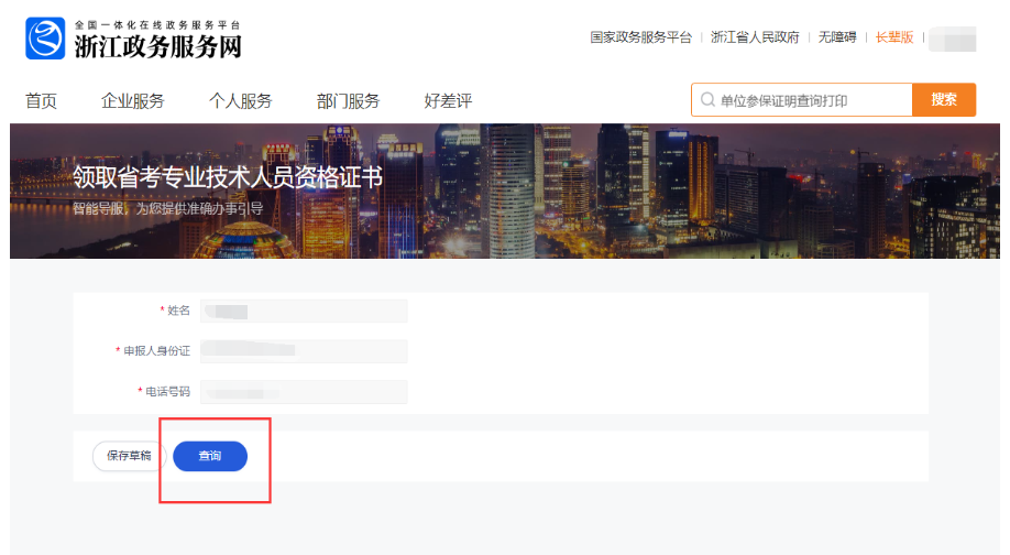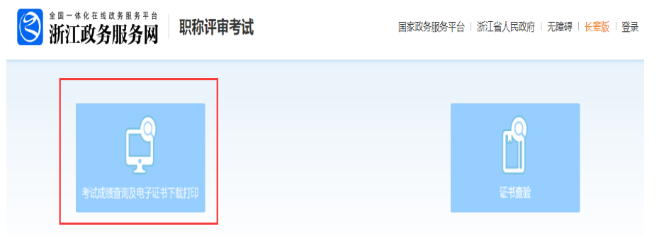 1.请考生登录浙江政务服务网,搜索“职称评审考试”栏目(网址:https://mapi.zjzwfw.gov.cn/web/mgop/gov-open/zj/2002238385/reserved/index.html)————点击“考试成绩查询及电子证书下载打印”。
