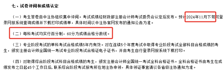 根据《2024年注册会计师全国统一考试报名简章》可知:2024年黑龙江注会考试查分时间预计在11月下旬,注册会计师各科合格标准均为60分,满分100分。