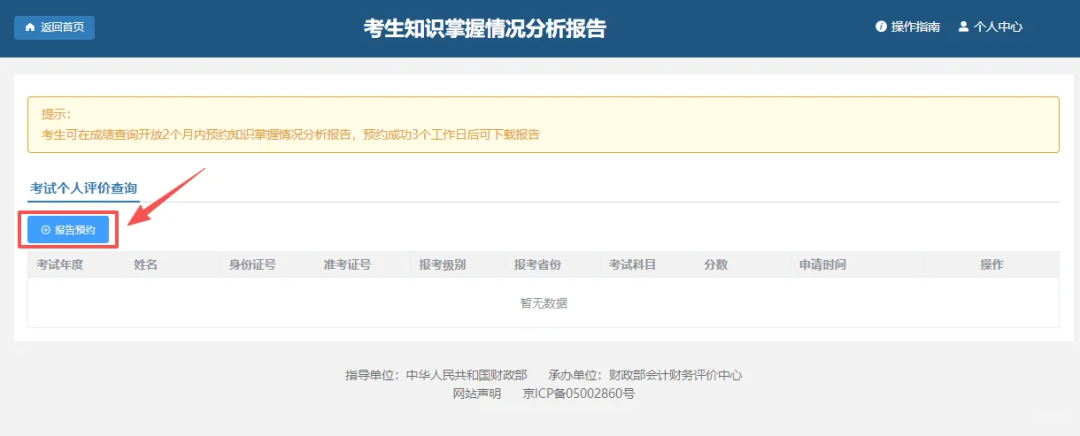 1.考生可在成绩查询开放2个月内预约知识掌握情况分析报告,预约成功3个工作日后可下载报告;