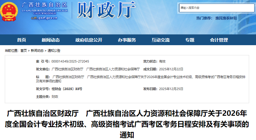 根据全国会计专业技术资格考试领导小组办公室(以下简称“全国会计考办”)《关于2026年度全国会计专业技术资格考试考务日程安排及有关事项的通知》(会考〔2025〕2号)规定,2026年度全国会计专业技术初级资格考试定于2026年5月举行,全部采用无纸化考试方式。现就2026年度初级会计资格考试广西考区考务日程安排及有关事项通知如下。