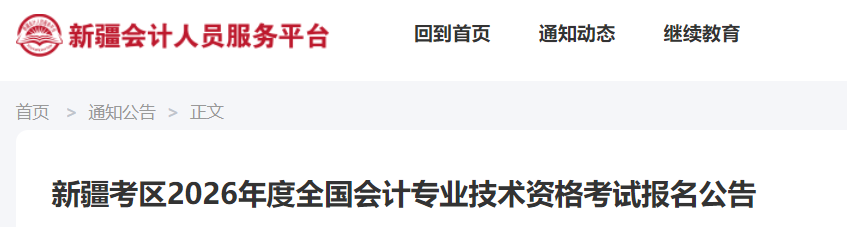 新疆考区2026年会计专业技术初级、高级资格考试报名时间为2026年1月8日至1月27日12:00截止,缴费时间为2026年1月8日至1月27日18:00截止。