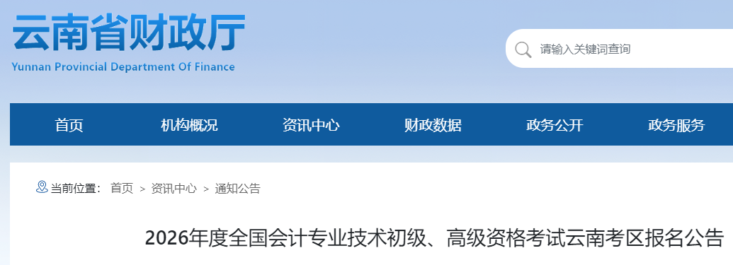根据全国会计专业技术资格考试领导小组办公室《关于2026年度全国会计专业技术资格考试考务日程安排及有关事项的通知》(会考〔2025〕2号)要求,为做好2026年度全国会计专业技术初级、高级资格考试(以下简称初级、高级会计资格考试)云南考区报名工作,现就相关事项公告如下: