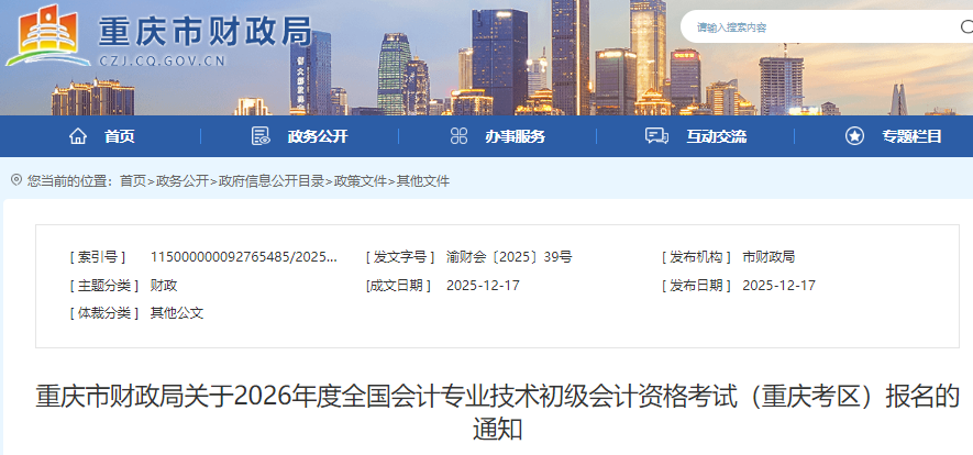 1. 2025年12月31日前,重庆市财政局公众信息网“会计之家”栏目公布重庆考区2026年度初级会计资格考试报名及缴费等相关事项。