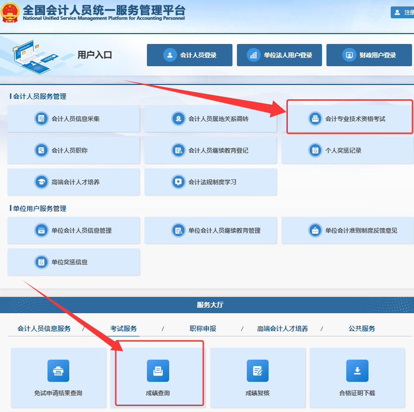 第一步:打开“全国会计人员统一服务管理平台https://ausm.mof.gov.cn/”,点击“会计专业技术资格考试”或考试服务“成绩查询”