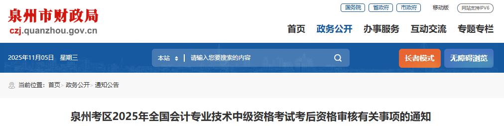 根据《福建省会计专业技术资格考试领导小组办公室关于做好2025年度会计专业技术资格考试考后资格审核有关事项的通知》(闽会考办〔2025〕3号),现就泉州考区会计中级资格考后现场审核有关事项通知如下:
