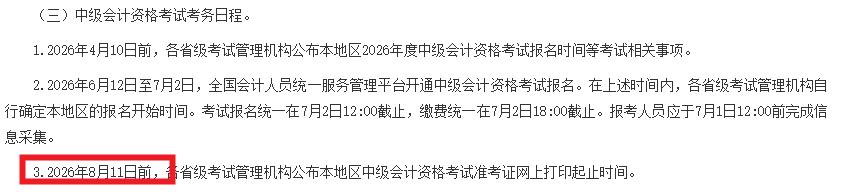 2026年8月11日前,各省级考试管理机构公布本地区中级会计资格考试准考证网上打印起止时间。(相较于2025年的8月12日提前1天。)
