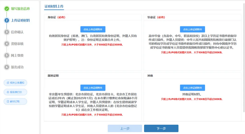 8.填写完报名信息,进入【上传证明材料】界面,根据要求上传对应的材料。注:各省报名流程及证明材料略有差异。