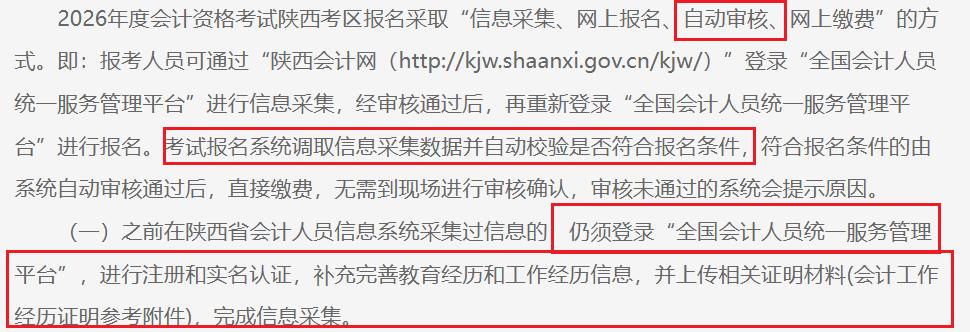 根据陕西会计网发布的《关于2026年度全国会计专业技术资格考试陕西考区考务日程安排及有关事项的公告》可知:2026年度会计资格考试陕西考区报名采取“信息采集、网上报名、自动审核、网上缴费”的方式。同时相关报考人员需要注意:之前在陕西省会计人员信息系统采集过信息的,仍须登录“全国会计人员统一服务管理平台”,进行注册和实名认证,补充完善教育经历和工作经历信息,并上传相关证明材料(会计工作经历证明参考附件),完成信息采集。